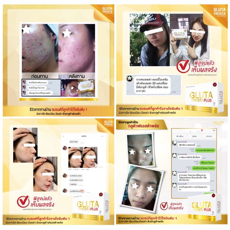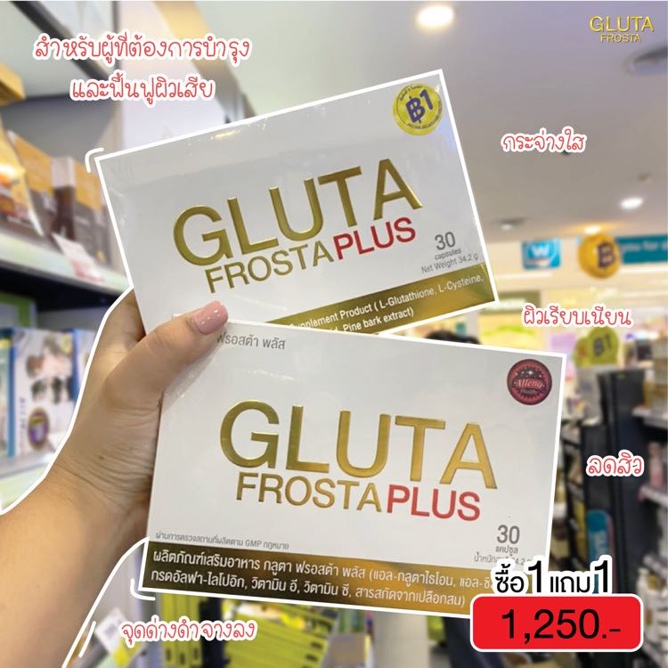กลูต้า ฟรอสต้า พลัส สามารถดูแลปัญหาสิวต่างๆ ได้อย่างดีเยี่ยม ด้วยการเข้าไปจัดการปัญหาถึง 4 มิติที่สำคัญ คือมิติที่ 1 คือมิติด้านการลดสิวที่มีอยู่แล้ว ซึ่งมีหลากหลายชนิดด้วย ให้ยุบตัวลง ซึ่งสิวที่มีอยู่แล้วนี้นั้น มีความสลับซับซ้อนสูงมากเนื่องจาก สาเหตุของการเกิดสิวมีมากมายทั้งจากสภาพแวดล้อม และจากฮอลโมนในร่างกาย อีกทั้งชั้นผิวหนังที่สิวเกิดก็ส่งผลต่อการแก้ไขที่แตกต่างกันอีก หากแต่ กลูตา ฟรอสต้า พลัส ก็สามารถจัดสรรสารอาหารที่ทรงคุณภาพในปริมาณที่เหมาะสม ทำให้สามารถจัดการกับปัญหาในมิตินี้ได้อย่างดียิ่ง เห็นผลใด้ในเวลาอันสั้น (หมายเหตุ ระยะเวลาการเห็นผลขึ้นกับชนิดของสิว และสภาพผิวของแต่ละบุคคล) มิติที่ 2 คือมิติด้านการลดสิวเกิดใหม่ มิติที่ 3 คือมิติด้านการสมานและลดรอยแผลเป็นของสิวที่แห้ง และมิติสุดท้ายคือมิติของการเตรียมความแข็งแรงของสภาพผิว เพื่อต่อสู้กับมลภาวะในอนาคต ด้วยความเข้าใจในมิติของปัญหาสิวอย่างลึกซึ้งของ กลูตา ฟรอสต้า พลัส ทำให้มีการแบ่งหมวดหมู่ของสารอาหารสำคัญเพื่อดูแลมิติแห่งปัญหาทั้งสี่ได้อย่างลงตัว ทำให้ได้ผิวที่ขาว สวย สดใส ไร้สิว อีกทั้งยังเตรียมความพร้อมของสภาพผิวให้แข็งแรงพร้อมรับกับมลภาวะต่างๆที่อาจก่อให้เกิดสิวได้ในอนาคต จึงเป็นการจัดการปัญหาเรื่องสิวได้อย่างสมบูรณ์แบบที่สุด วิธีรับประทาน วันละ 1-2 แคปซูล ทานหลังอาหารเช้า 1 แคปซูล และควรทานหลังอาหารเย็น 1 แคปซูล